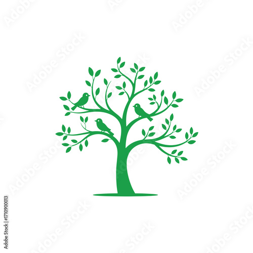 Tree with green leaves vector, Green Tree Silhouette with Birds on Branches