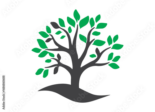 Tree with roots, a symbol of growth and life, with green leaves, branches, and flowers, representing spring and nature's vibrant ecology