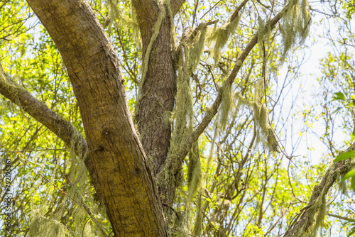 Tree with Spanish moss in a lush green forest on a sunny day.