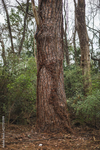 tree with vines growing on it in the park