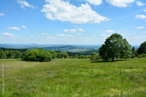 Trees and a green meadow on a mountain in the high Rhön with a view of the valley