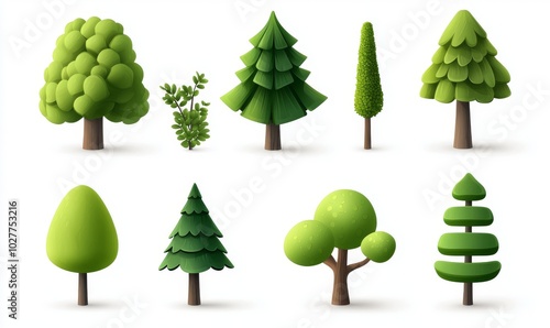 Trees bushes with foliage. Cartoon forest plants. Minimal shrub botanical garden elements. Flat set, stock photo.