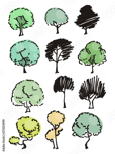 Trees sketch set, cartoon vintage illustration, ink draw engraved style, hand drawn isolates