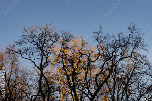 trees without leaves on blue sky background