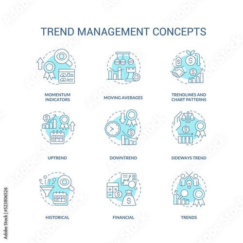 Trend management turquoise concept icons set. Tendencies analysing process. Strategy idea thin line color illustrations. Isolated symbols. Editable stroke. Roboto-Medium, Myriad Pro-Bold fonts used