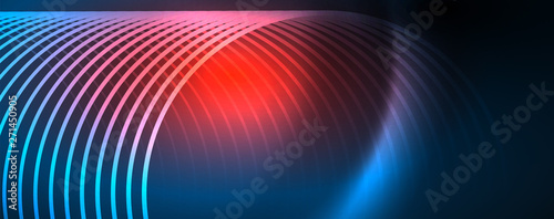 Trendy neon blue abstract design with waves and circles. Neon light glowing effect. Abstract digital background.