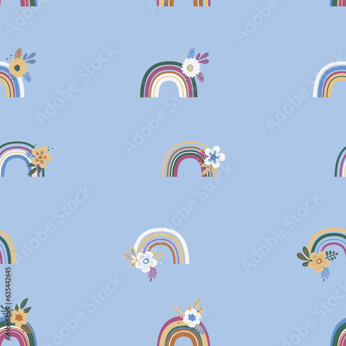 Trendy seamless pattern with colorful rainbow on color background. Design for invitation, poster, card, fabric, textile, fabric. Cute holiday illustration for baby. Scandinavian doodle style