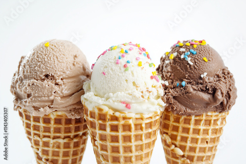 Trio ice cream scoop in waffle cone isolated on white background, Selective focus vanilla, chocolate and coffee gelato cone with fancy sprinkle on white.