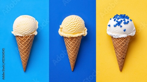 Trio of Delicious Ice Cream Cones on Colorful Background