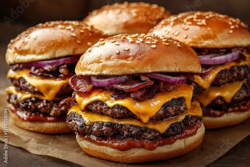 Triple stacked cheeseburgers with melted cheese dripping over patties on wooden surface conveying intense fast food indulgence and visual appetite stimulation