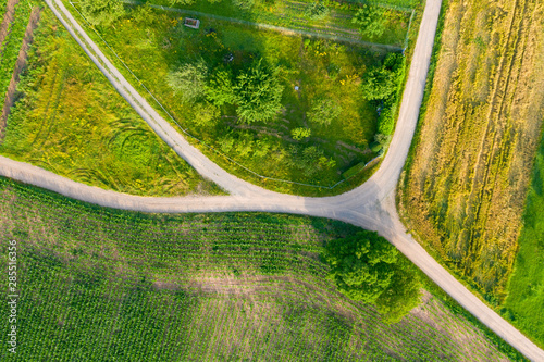 Trois routes qui se croisent au milieu des vignes vue éloignée