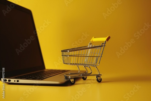 Trolley and laptop illustration, online store concept, yellow background. Generative AI