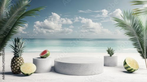 Tropical beach showcase with concrete platform, pineapple, and watermelon slices