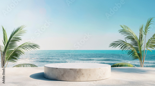 Tropical beach with round concrete platform and palm trees. Copy space. Generative AI