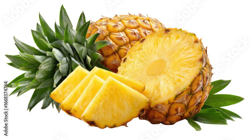 Tropical Bounty: A vibrant display of pineapple, both whole and sliced, showcasing the fruit's juicy flesh and spiky green leaves, a delicious reminder of a tropical getaway.