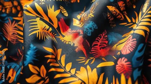 Tropical dinosaur patterned fabric in vibrant colors illuminated by sunlight creating a lively and dynamic textile design
