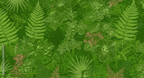 Tropical Foliage Pattern with Ferns and Flowers in Green Hues