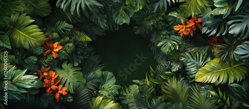 Tropical frame adorned with lush green foliage and vibrant orange flowers creating a natural border highlighting the beauty of nature.