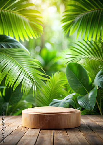 Tropical green background with empty table top in front.