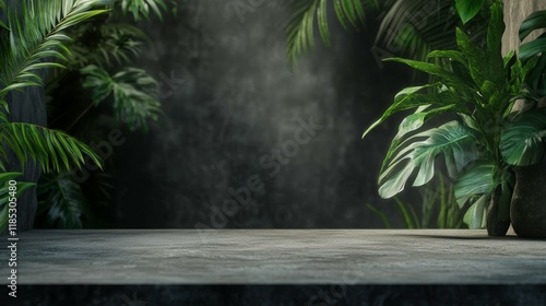 Tropical green foliage with a dark background and a concrete surface in the foreground