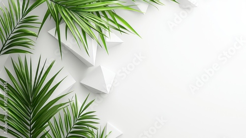 Tropical palm leaves and white geometric shapes on white background.