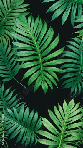 Tropical palm leaves pattern on dark background. Exotic green foliage texture for botanical design, wallpaper, and nature concept