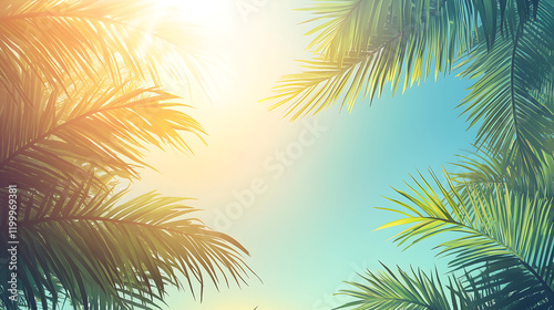 tropical palm leaves silhouetted against a bright, sunlit sky