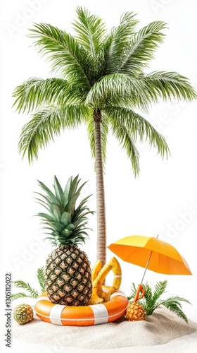 Tropical paradise scene with pineapple palm tree banana and umbrella on a sandy beach backdrop evoking vacation vibes and summer mood
