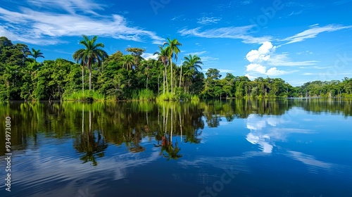 Tropical Rainforest Lagoon with Palm Trees and Reflection of Sky