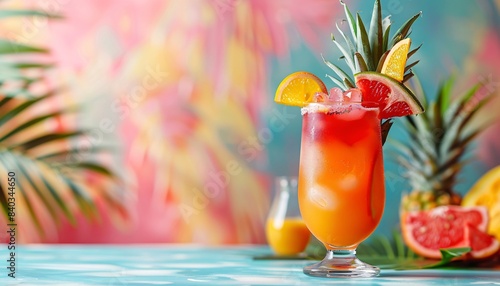 Tropical Refreshing Cocktail with Citrus Garnish and Pineapple on a Vibrant Background