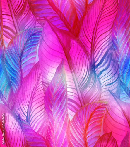 Tropical summer seamless pattern with banana leaves and flowers of strelitzia. Watercolor illustration with a rainforest