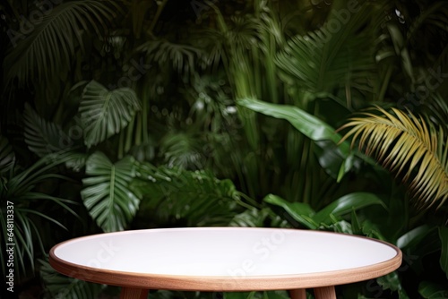 Tropical tranquility. Verdant oasis. Empty wooden table with green paradise. Nature haven of relaxation. Jungle retreat. Embracing wild beauty