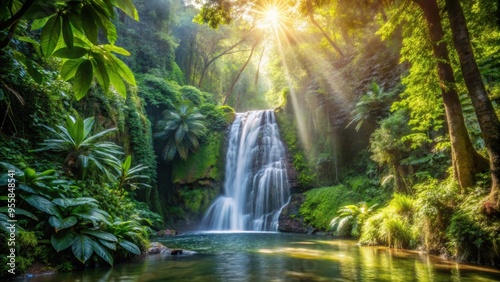 Tropical waterfall surrounded by lush greenery, with a stream and sunlight shining through, waterfall, lush greenery, stream