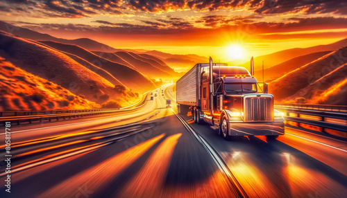 Truck speeds along a mountainous highway, bathed in the fiery glow of a sunset.