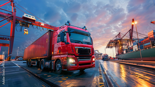 Truck trailer on the pier in the cargo port terminal with cranes and containers. AI Generated