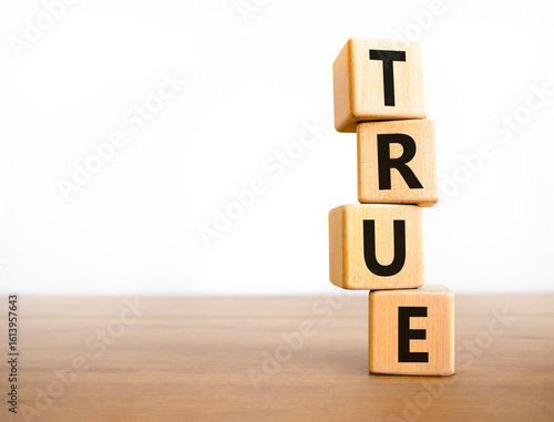True symbol. Concept word True on beautiful wooden blocks. Beautiful wooden table white background. Business, lifestyle, support and true concept. Copy space.