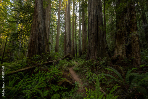Trunks Of Giant Redwood Trees Dwarf The Trail Through The Forest