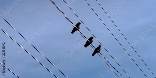 Trzy kawki siedzące na przewodach trakcyjnych na tle błękitnego nieba. Czarne inteligentne ptaki z rodziny krukowatych siedzą na przewodach elektrycznych i "naradzają się" (!?) nad programem dnia.