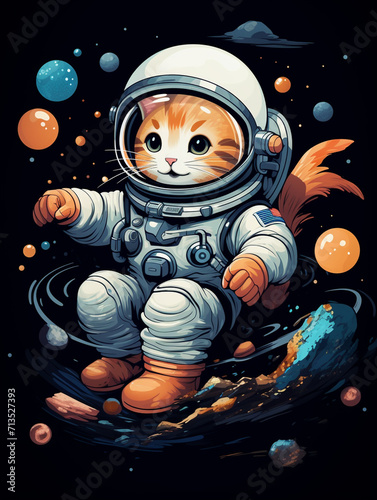 T-shirt design, playful astronaut cat, floating in zero gravity, fish-shaped stars, whimsical, cute and quirky, bright oranges and blues created with Generative Ai