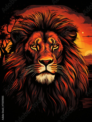 T-shirt design, powerful lion portrait, regal and intense, African savanna background, sunset colors, deep oranges and blacks created with Generative Ai
