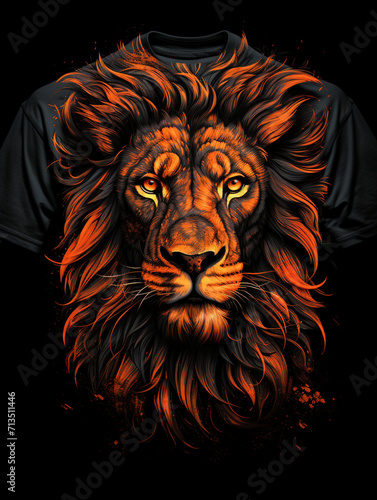 T-shirt design, powerful lion portrait, regal and intense, African savanna background, sunset colors, deep oranges and blacks created with Generative Ai