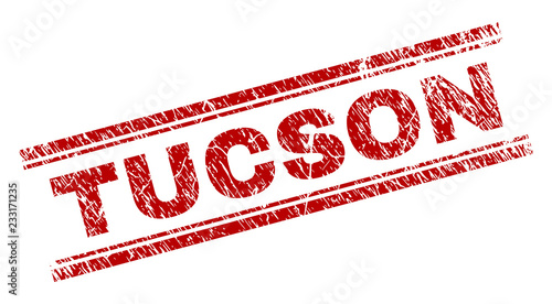 TUCSON seal print with grunge texture. Red vector rubber print of TUCSON text with corroded texture. Text label is placed between double parallel lines.