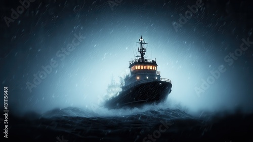 Tugboat Navigating Through Stormy Waters in Harsh Weather Conditions at Night
