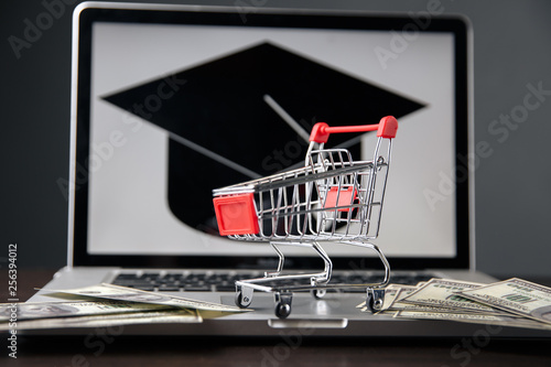 Tuition fee or student loan with calculator. Education price , savings fund college, and expenses concept. Money and papers on table. Calculating budget and planning finance.