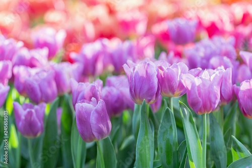 Tulip flower with green leaf background in tulip field at winter or spring day for postcard beauty decoration and agriculture concept design.