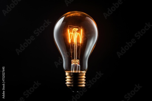 Tungsten light bulb lit on black background, Incandescent light bulb, Ai generated