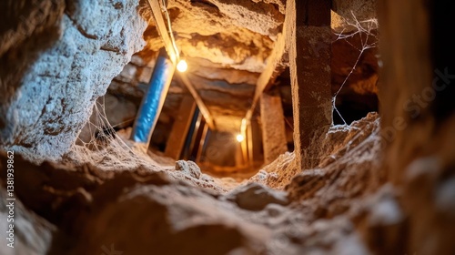 Tunnel interior view with wooden supports illuminated by warm lights and textured rock walls in a tight space perspective