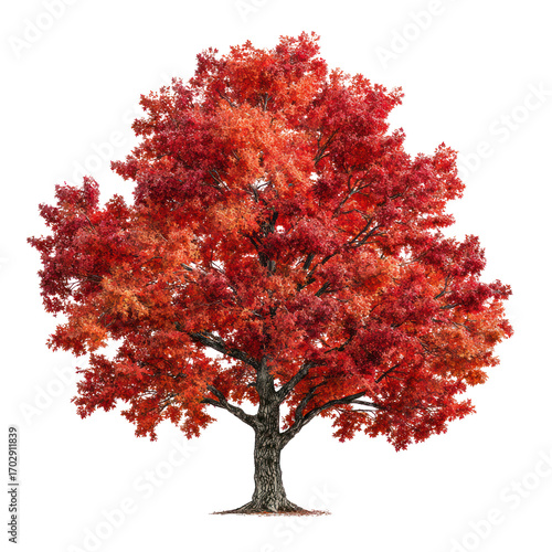 Tupelo tree with glossy red autumn leaves and rough dark bark on white background