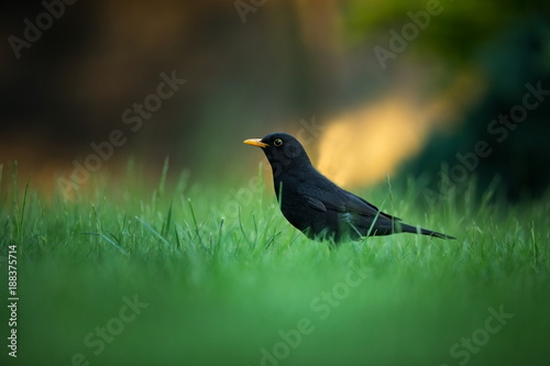 Turdus merula. Expanded throughout Europe. South Asia. Australia and New Zealand. Wild nature of Czech. Beautiful image of nature. Free nature. Photographed in Czech. Spring theme. Bird on the tree an