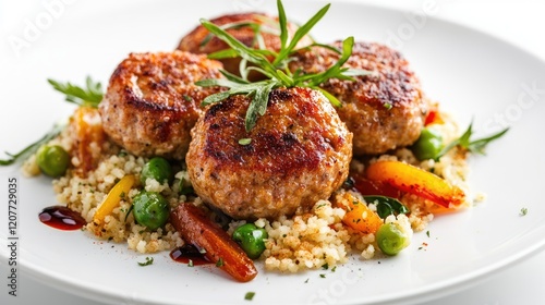 Turkey meat cutlets served on couscous with colorful vegetables and herbs showcasing a gourmet restaurant main course close up presentation